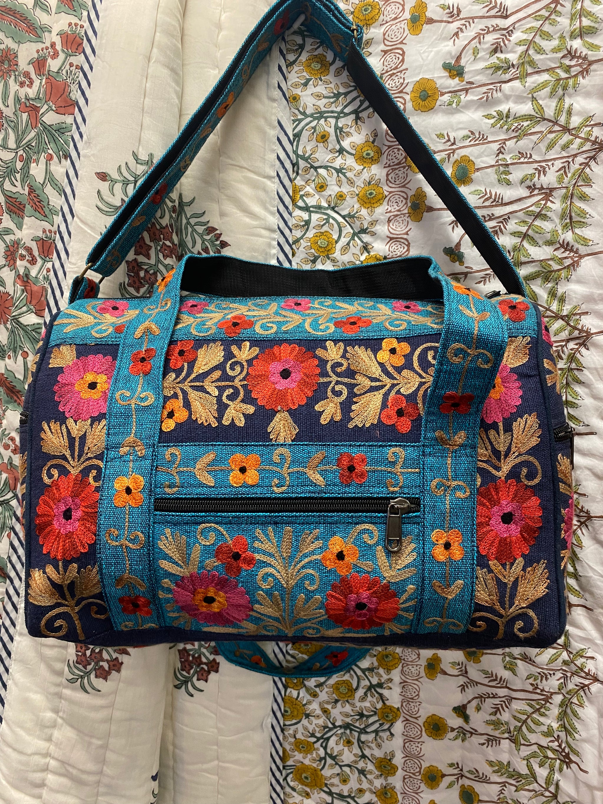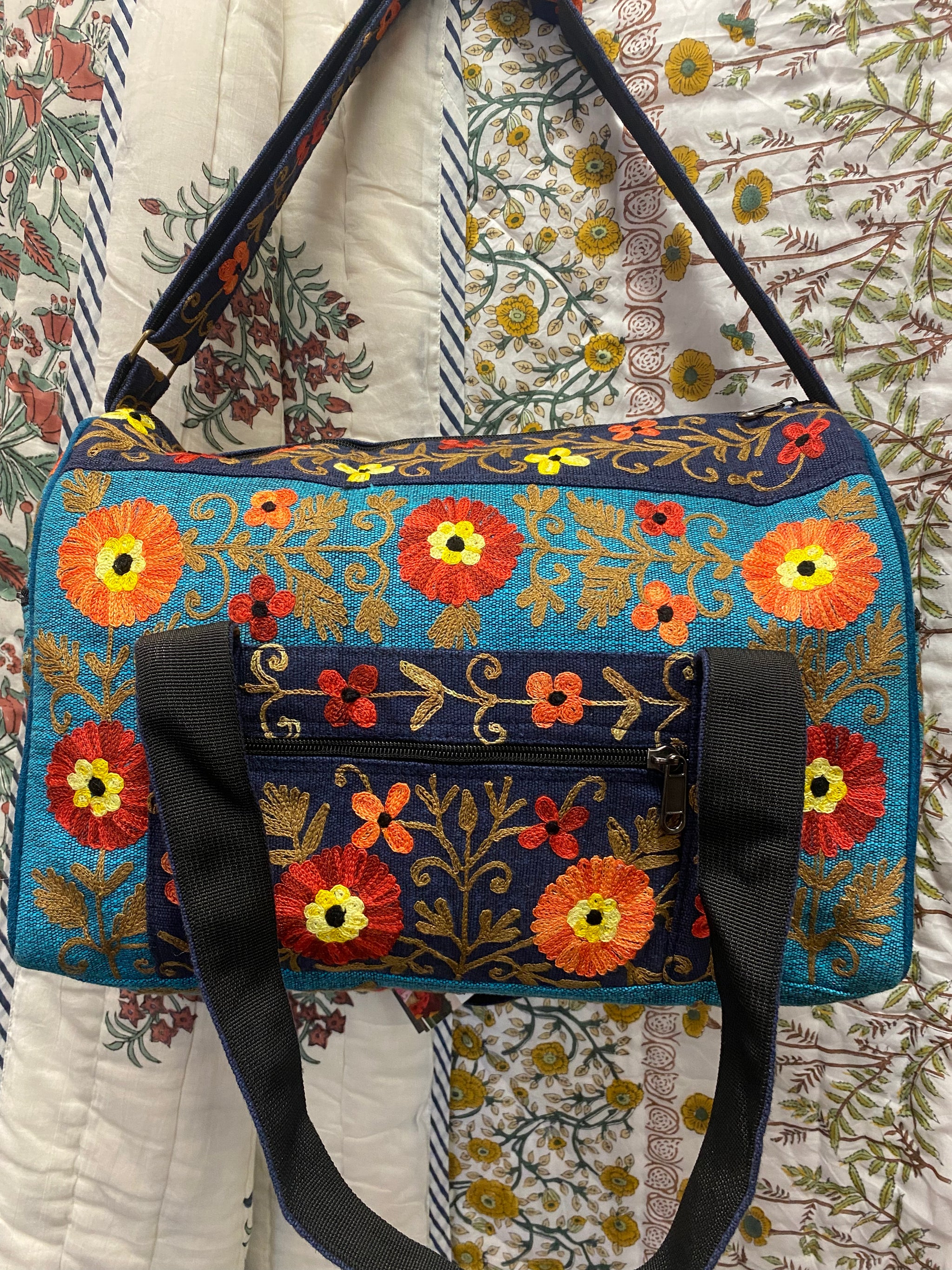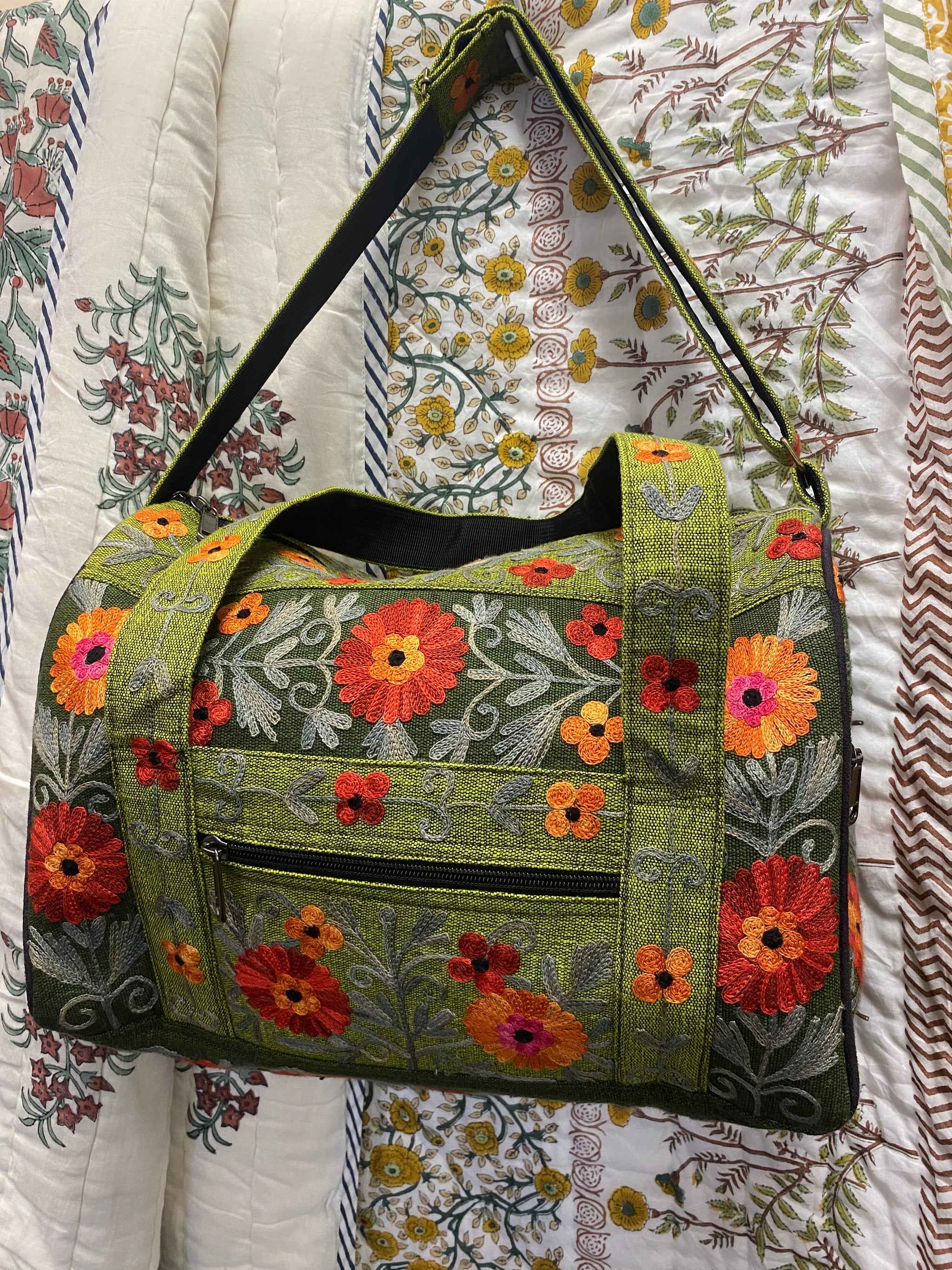 Product Description:This small hand-embroidered travel duffle bag is designed to be both beautiful and practical. Made from strong hand-woven cotton and finished with detailed floral embroidery, it’s a practical and...