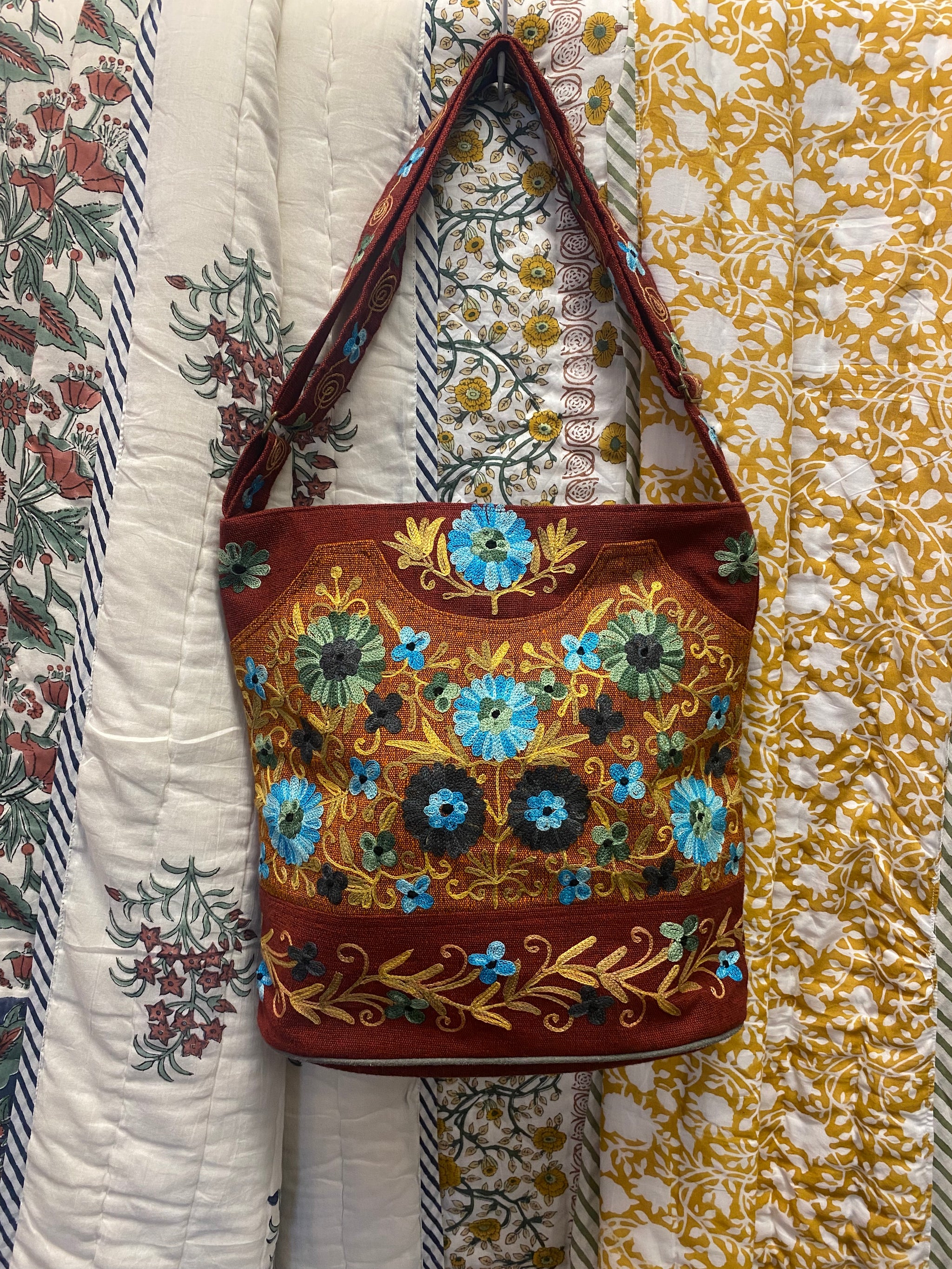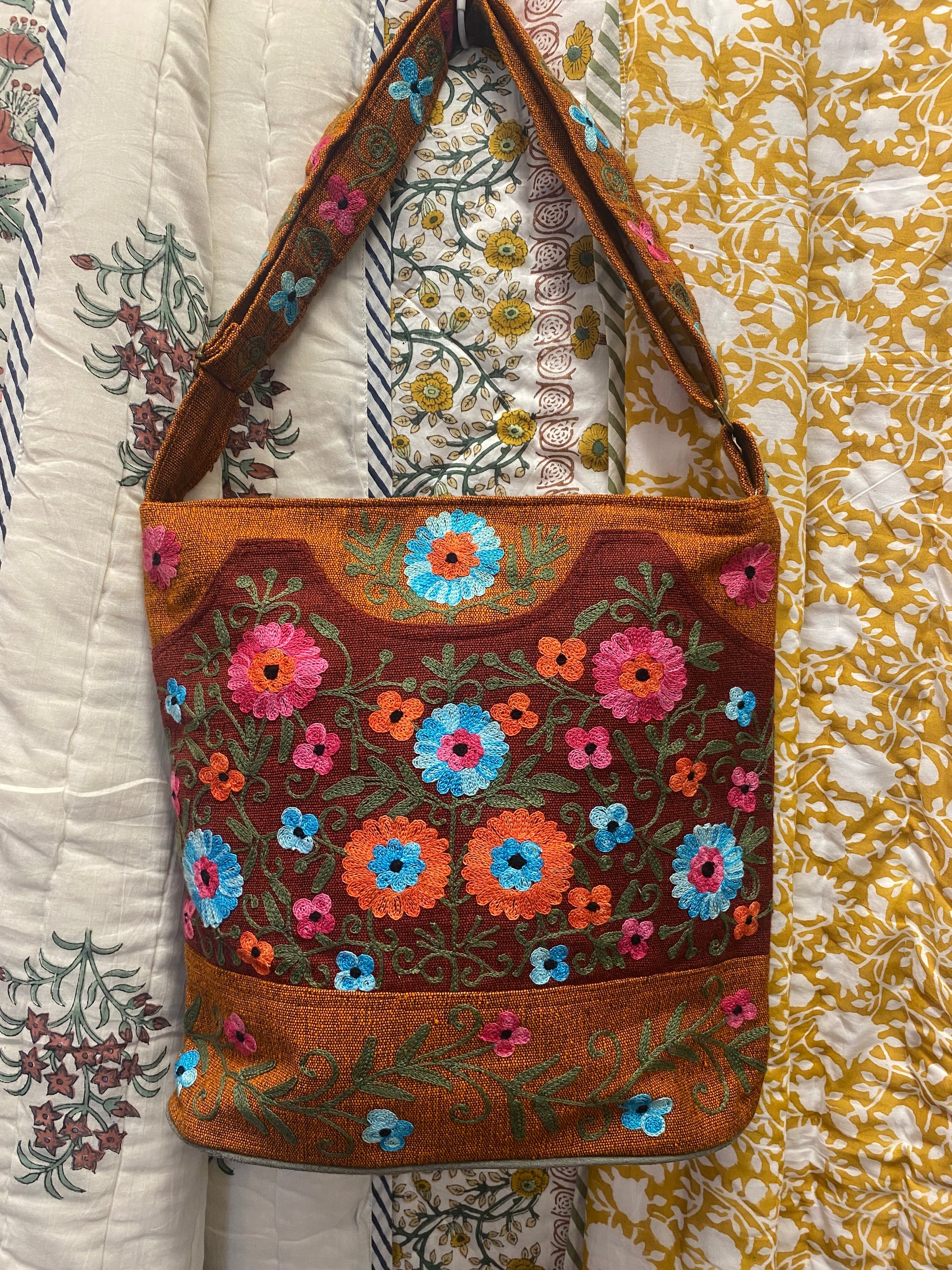 Product Description:This large hand-embroidered cotton shoulder bag is designed for everyday use, with the strength and space to keep up with busy days. Made from durable hand-woven cotton and finished...