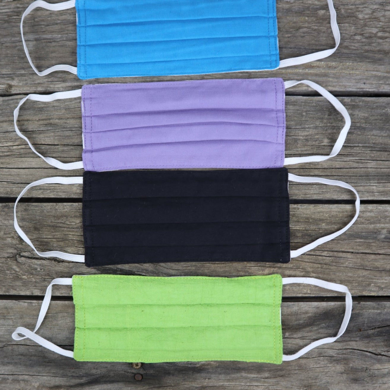 Plain coloured, pure cotton, washable and comfortable around your ear, these practical masks will help keep you and your family safe. Neatly pleated and well stitched, you can breathe easily with protection.